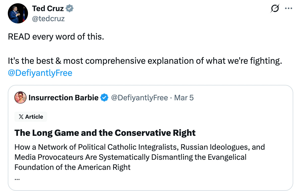 Ted Cruz återpublicerade texten med varma rekommendationer. Vilket fick en rad katolska influencers – bland andra Prejean Boller – att fördöma Cruz.