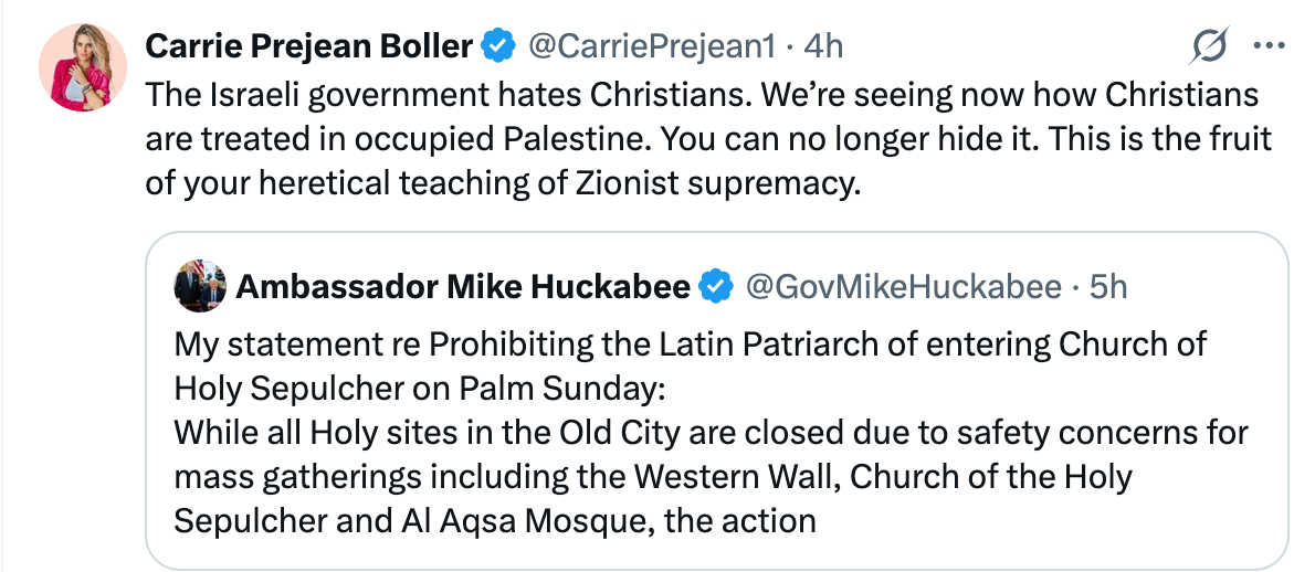 Katolske MAGA-rösten Carrie Prejean Boller var inte sen med att snappa upp detta och slå tillbaka mot både Israel och den evangelikala högern: