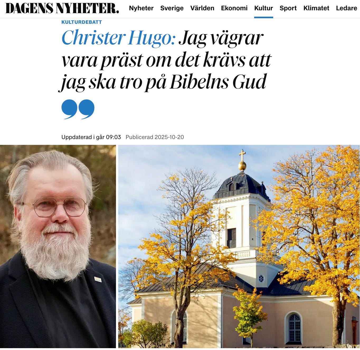 Jag säger naturligtvis inte att Hugo tror så här just i detta fall, men när en präst säger sig ha “tagit farväl av Bibelns gud” väcker det frågor. Representerar Hugo något av det som prästkragen signalerar, eller planerar han uttrycka sina egna tankar i alla frågor?