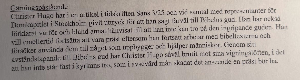 Sandahl anmälde därför Hugo till Stockholms domkapitel i somras, och så började juridikens kvarnar att mala. Nu har ärendet kommit upp på bordet och domkapitlet har formulerat ett gärningspåstående. Det låter ju allvarligt, men det är helt enkelt en sammanfattning av anklagelsen. Så här skriver man: